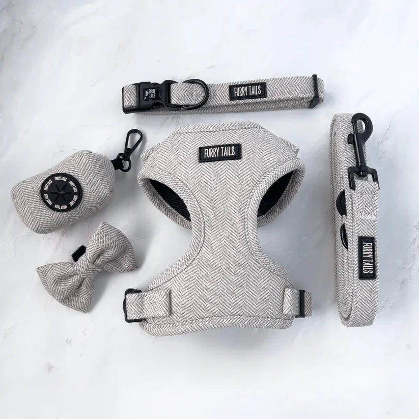 The 'Coco' Collection brought to you by Furry Tails - Classic Elegance in Chocolate Tweed. Furry Tails' latest dog-walking set, designed in a rich chocolate hue, offers an adjustable dog harness, dog collar, lead, poop bag holder, and dog bow tie. It's straightforward style and functionality for today's dog owner.